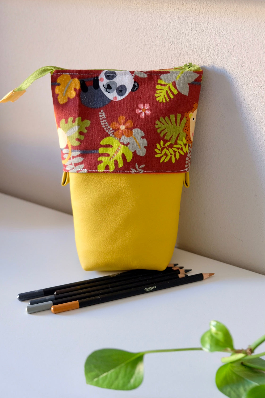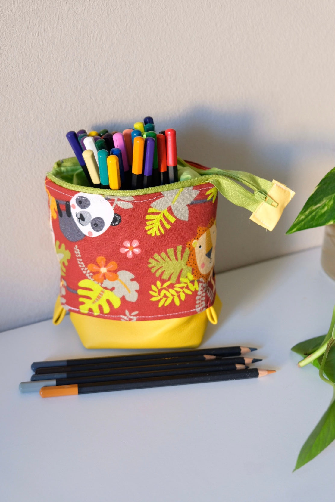 Questo astuccio rimane in piedi da solo. Pennarelli, matite colorate e penne sono a portata di mano per poter essere utilizzate con praticità.