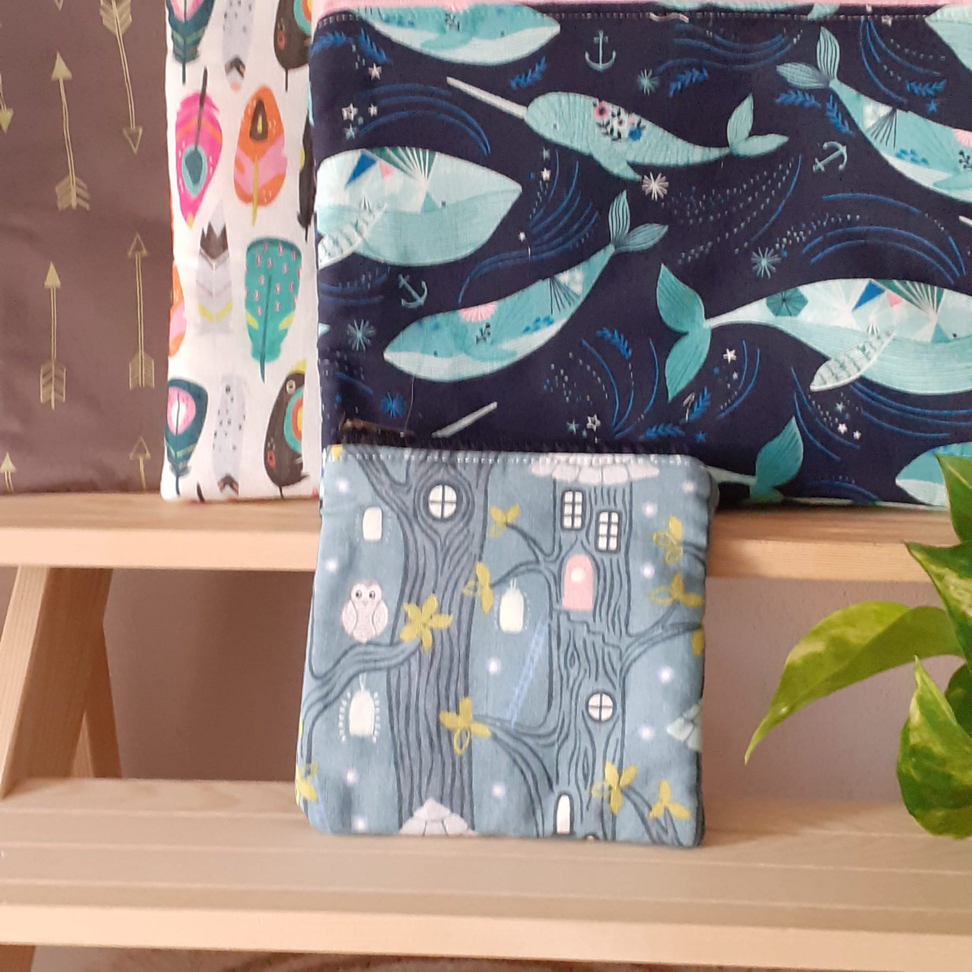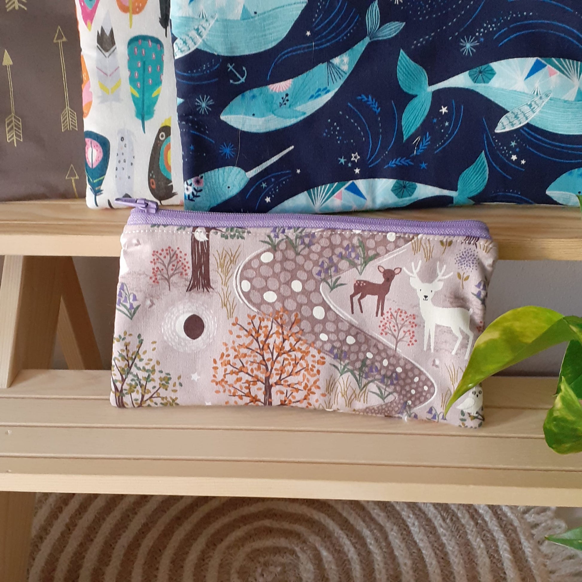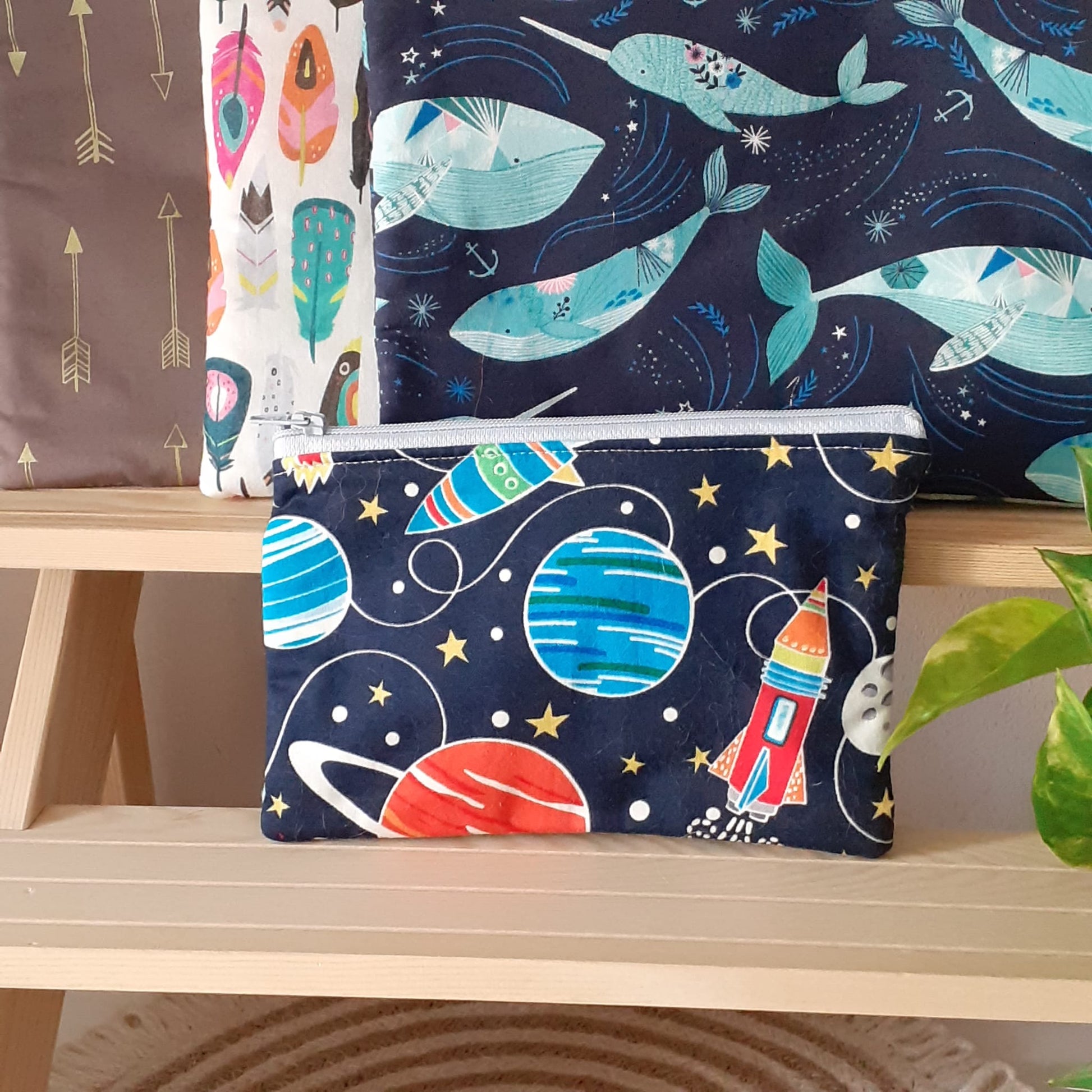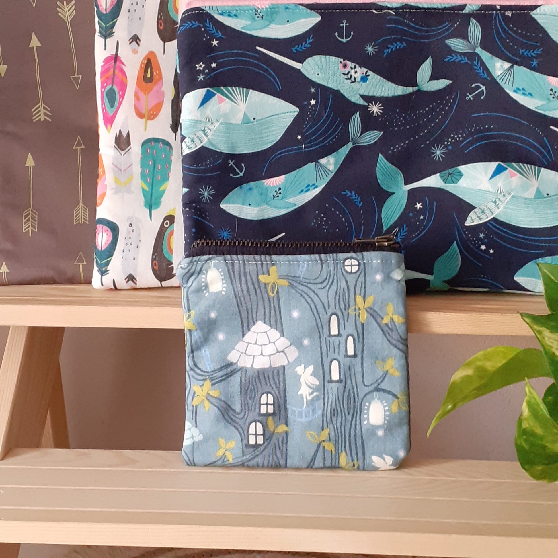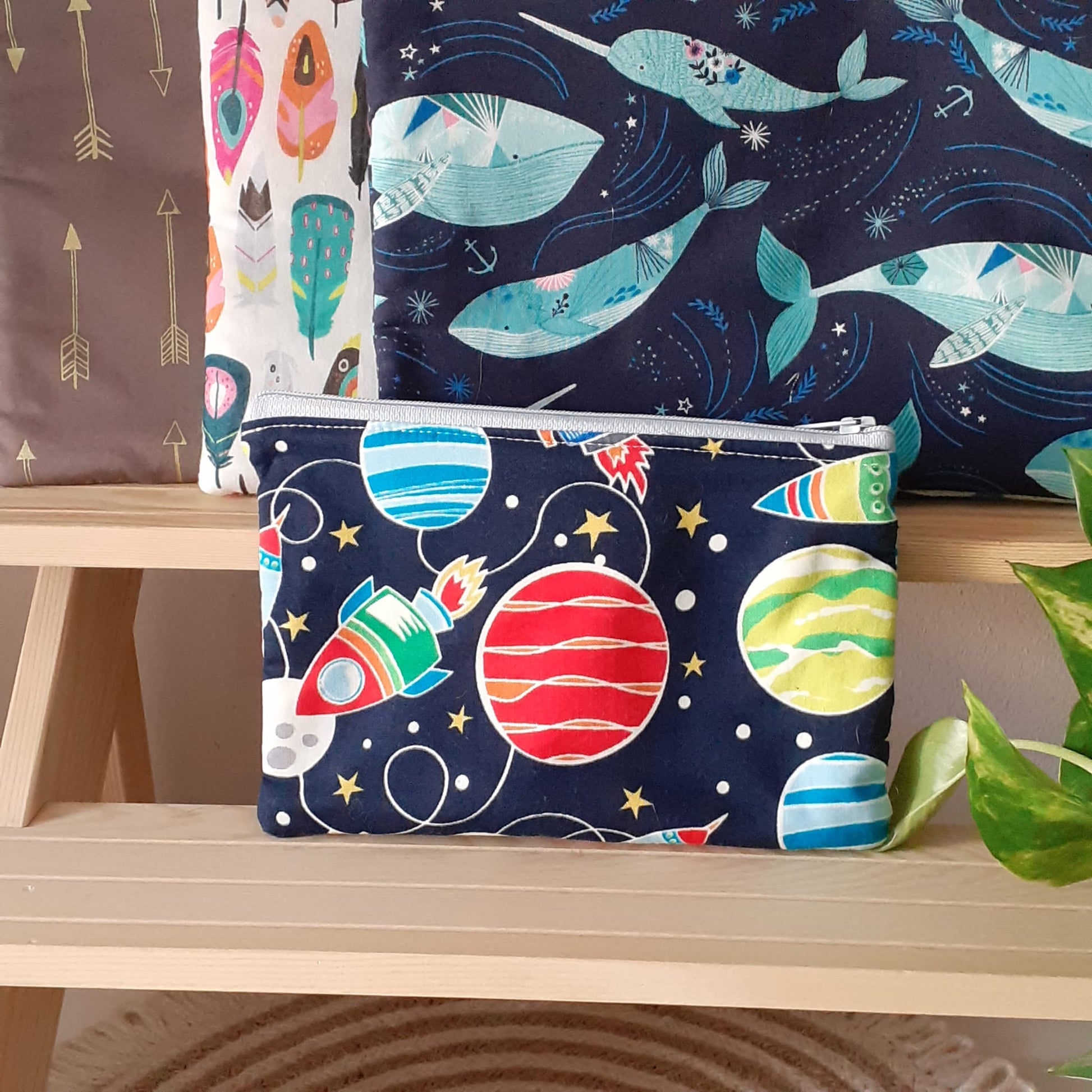 Astuccio con zip realizzato con tessuto fantasia in cotone.