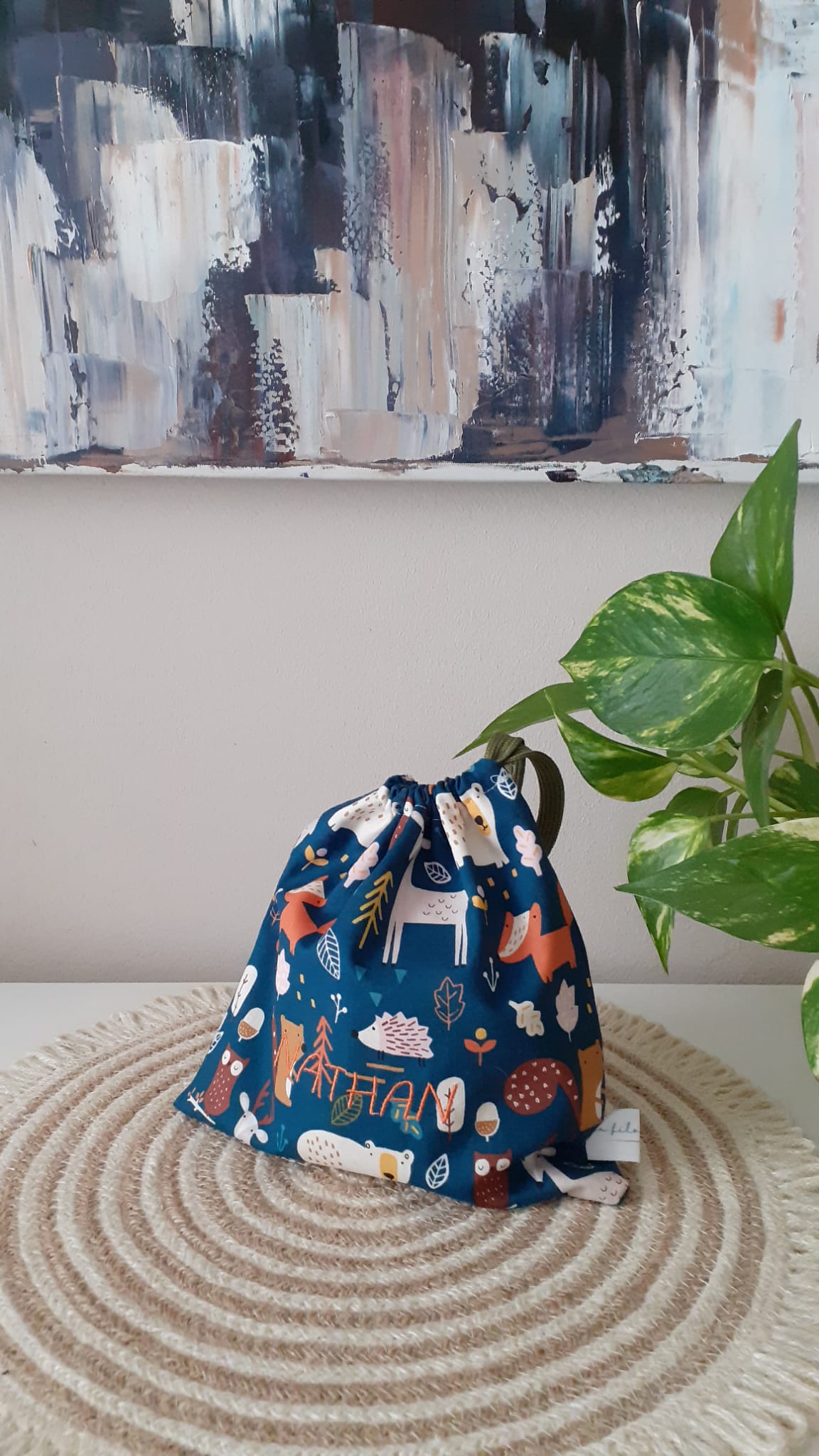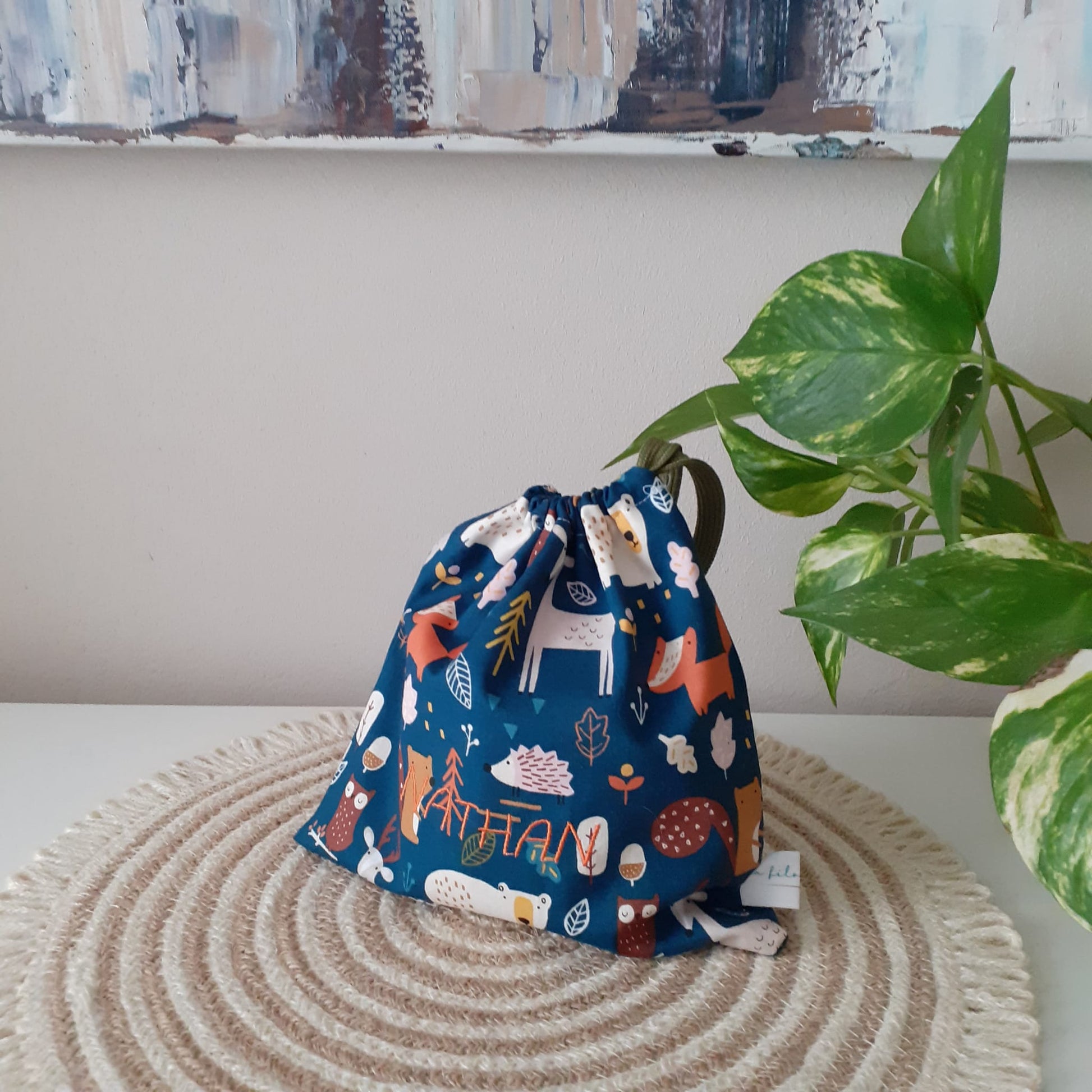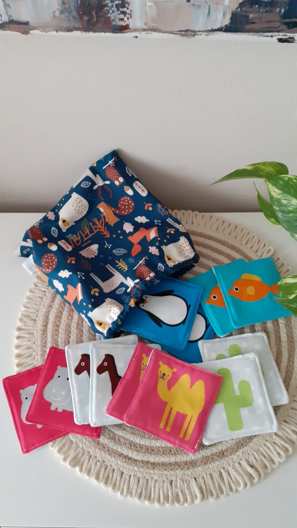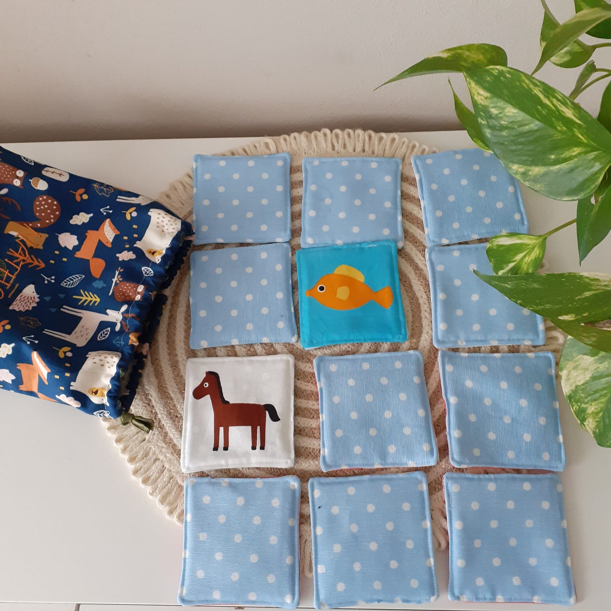 Memory in stoffa composto da 12 tessere colorate lavabili in lavatrice. La sacca può essere personalizzata con il nome del bambino.