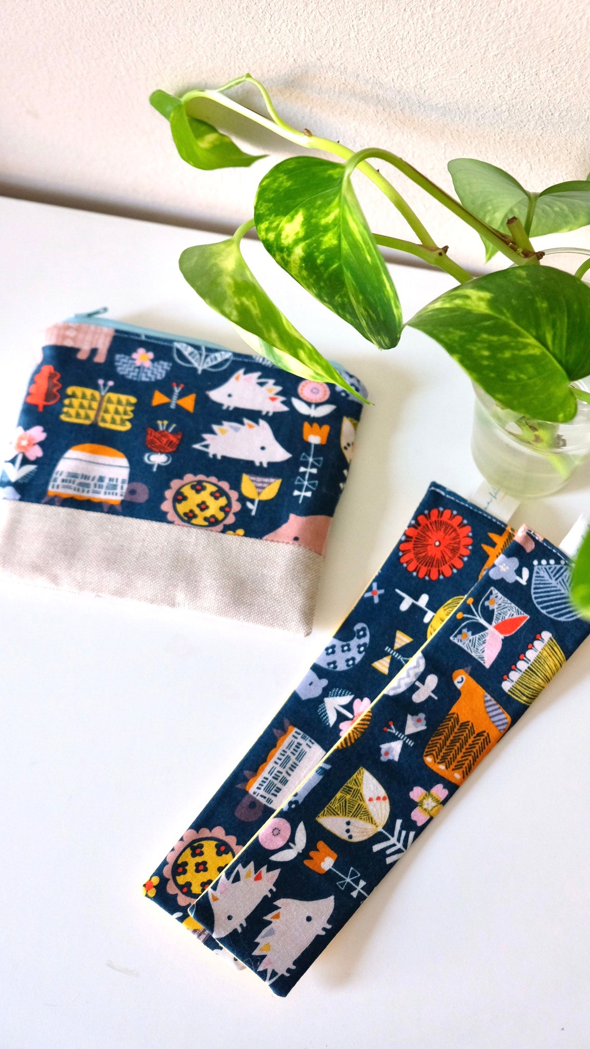 Pochette in cotone fantasia rifinita con banda in cotone grezzo.