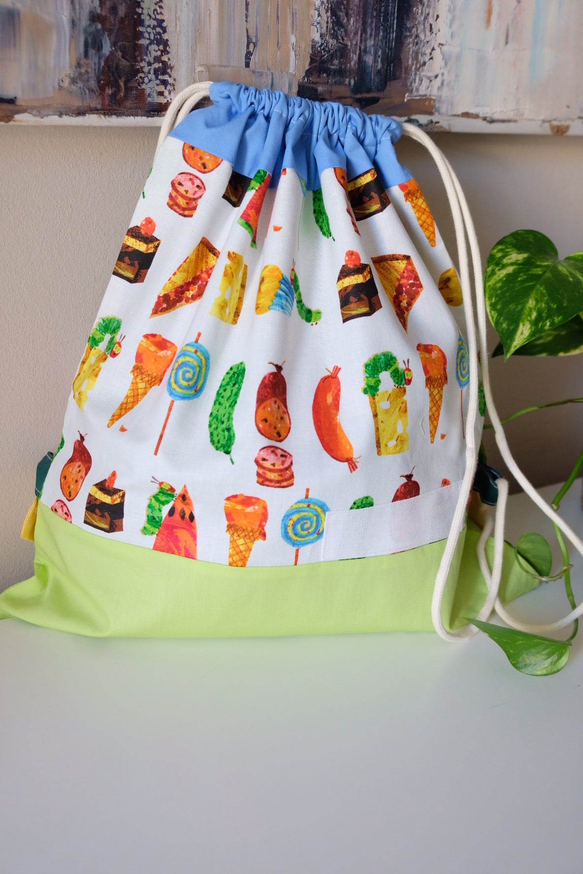 Sacca asilo in stoffa fantasia con cordino in cotone a zainetto