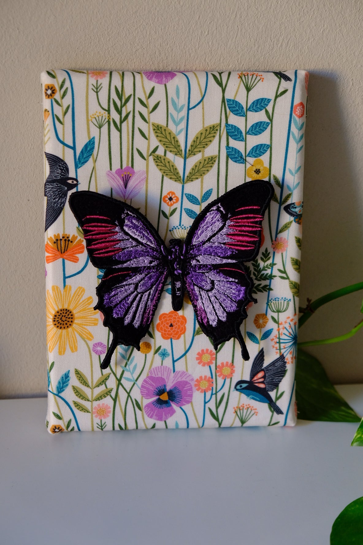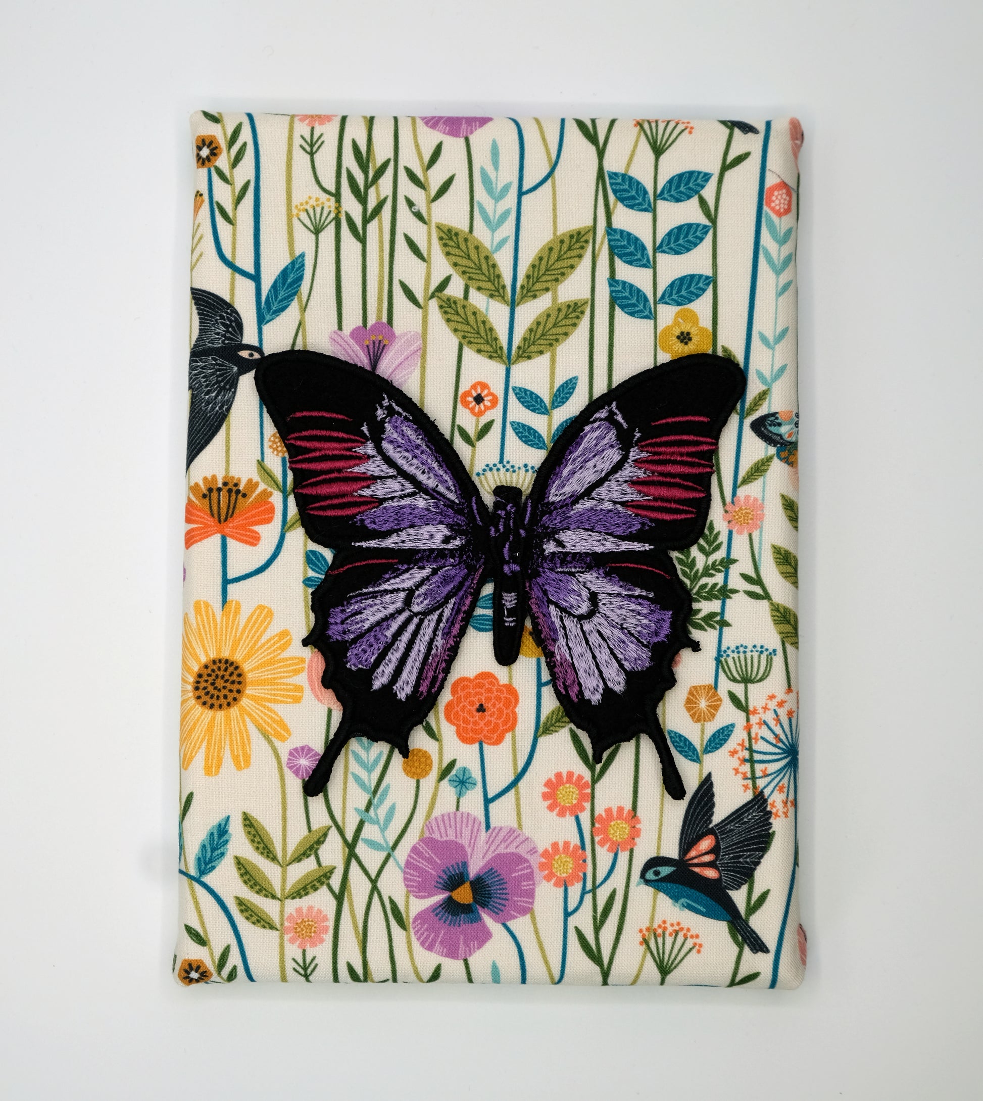 Tela in cotone fantasia e applicazione ricamata in rilievo.