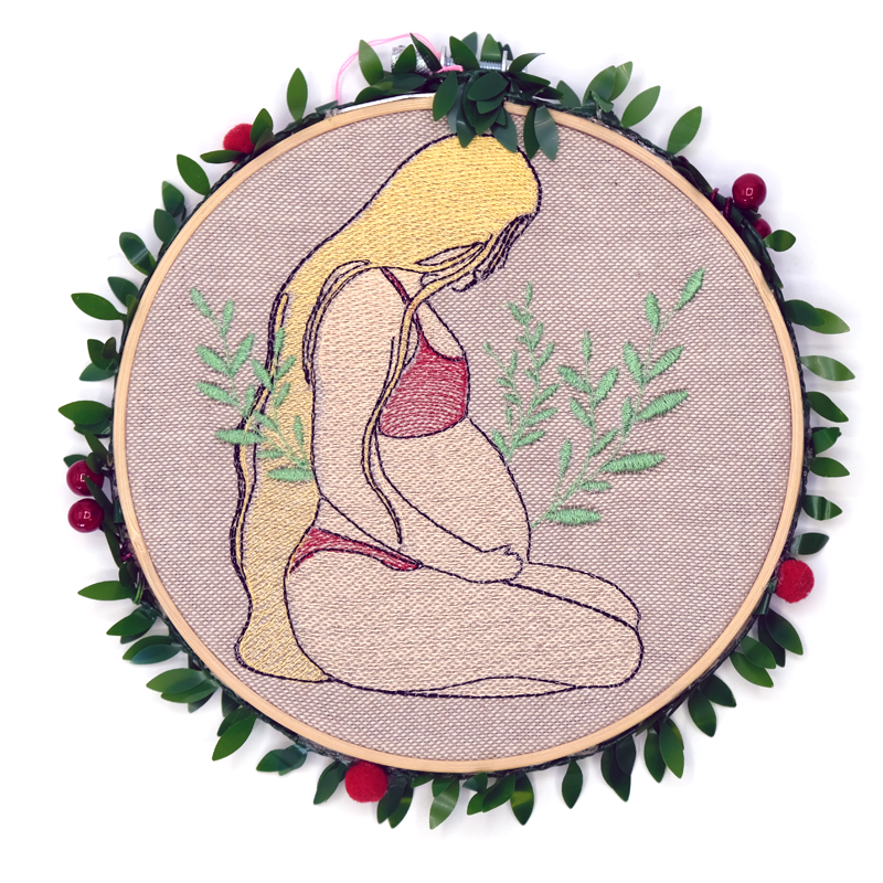 Telaio tondo in bamboo, ricamo su cotone grezzo.
