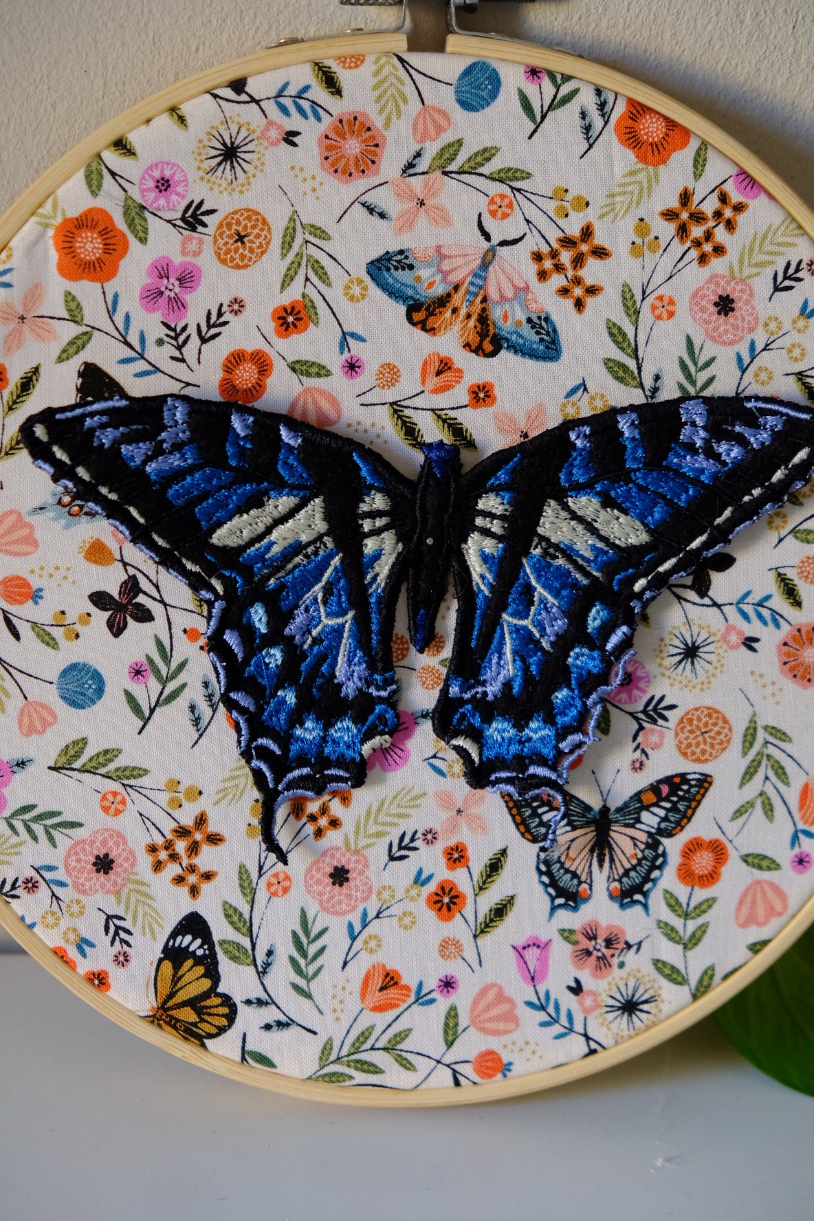 Materiali: tessuto 100% cotone, libellula ricamata su feltro, telaio in bambù
