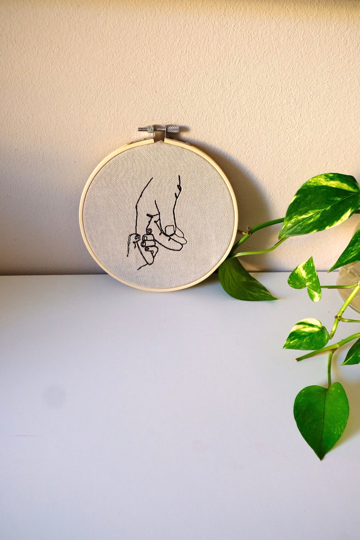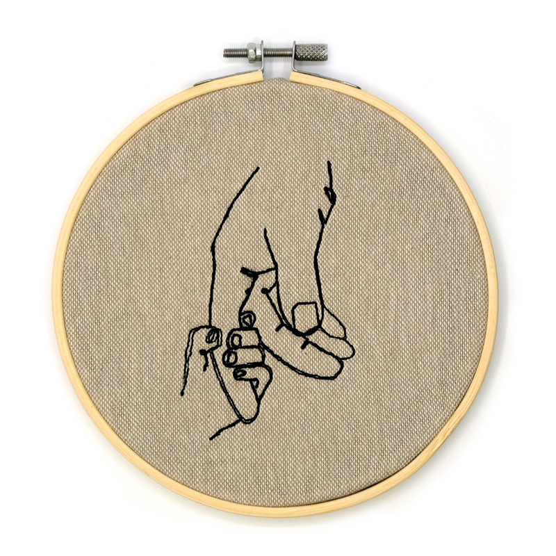 Telaio tondo in bamboo, ricamo su cotone grezzo.